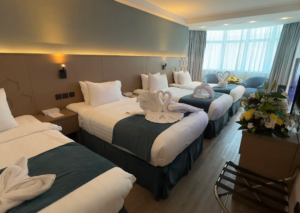 Hotel ini menyediakan berbagai tipe kamar yang dapat disesuaikan dengan kebutuhan jamaah, seperti kamar quad (4 orang), triple (3 orang), maupun double (2 orang). Setiap kamar dilengkapi dengan tempat tidur yang nyaman, lemari penyimpanan, serta perlengkapan dasar yang mendukung kenyamanan selama menginap.